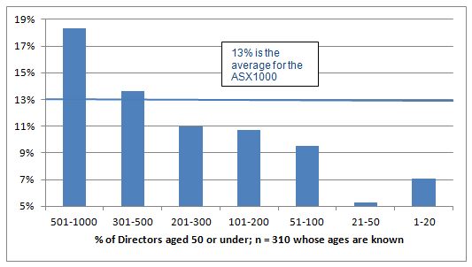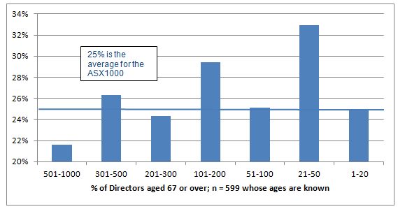 According to this data, the age of the average director for the top 1000 Australian companies is approximately 61, with a trend to older directors on major company Boards.