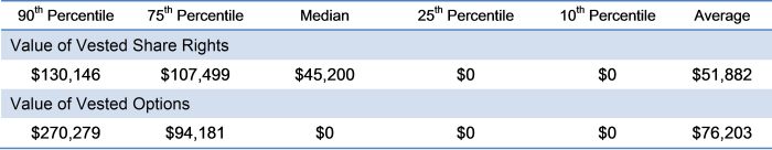 We explored the likely return to executives in the ASX100 for a hypothetical $100,000 grant of shares and $100,000 grant of options, with vesting benchmarked to relative Total Shareholder Return for the ASX 100 over the most recent 3-year award period: awards following the 2009 Annual General Meeting and vesting in the final quarter of 2012. The vesting schedule saw 50% of shares or options vest at median Total Shareholder Return performance, while 100% vested at 75th percentile performance.