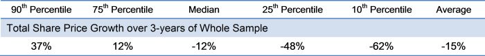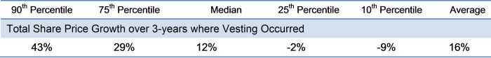 Due to the vesting schedule, no shares or options vested below the median. Yet despite a fall in median share price, there was vesting of shares at median, such that executives who presided over a fall in share price over the three years received a benefit from their long term incentive plan. This can be seen in the table below, showing the share price growth distribution for companies where at least part of executives’ rewards vested.