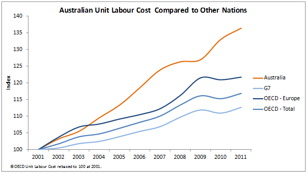2. Australia’s unit labour cost (average cost of labour/real output) has risen significantly over the last ten years.