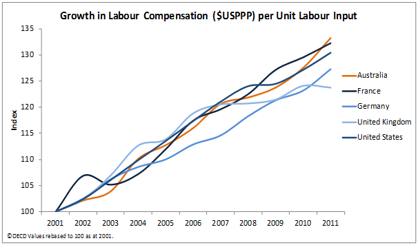 3. The labour compensation per unit labour input (compensation over total hours worked) has increased at a higher rate than other nations, even taking cost of living into account.